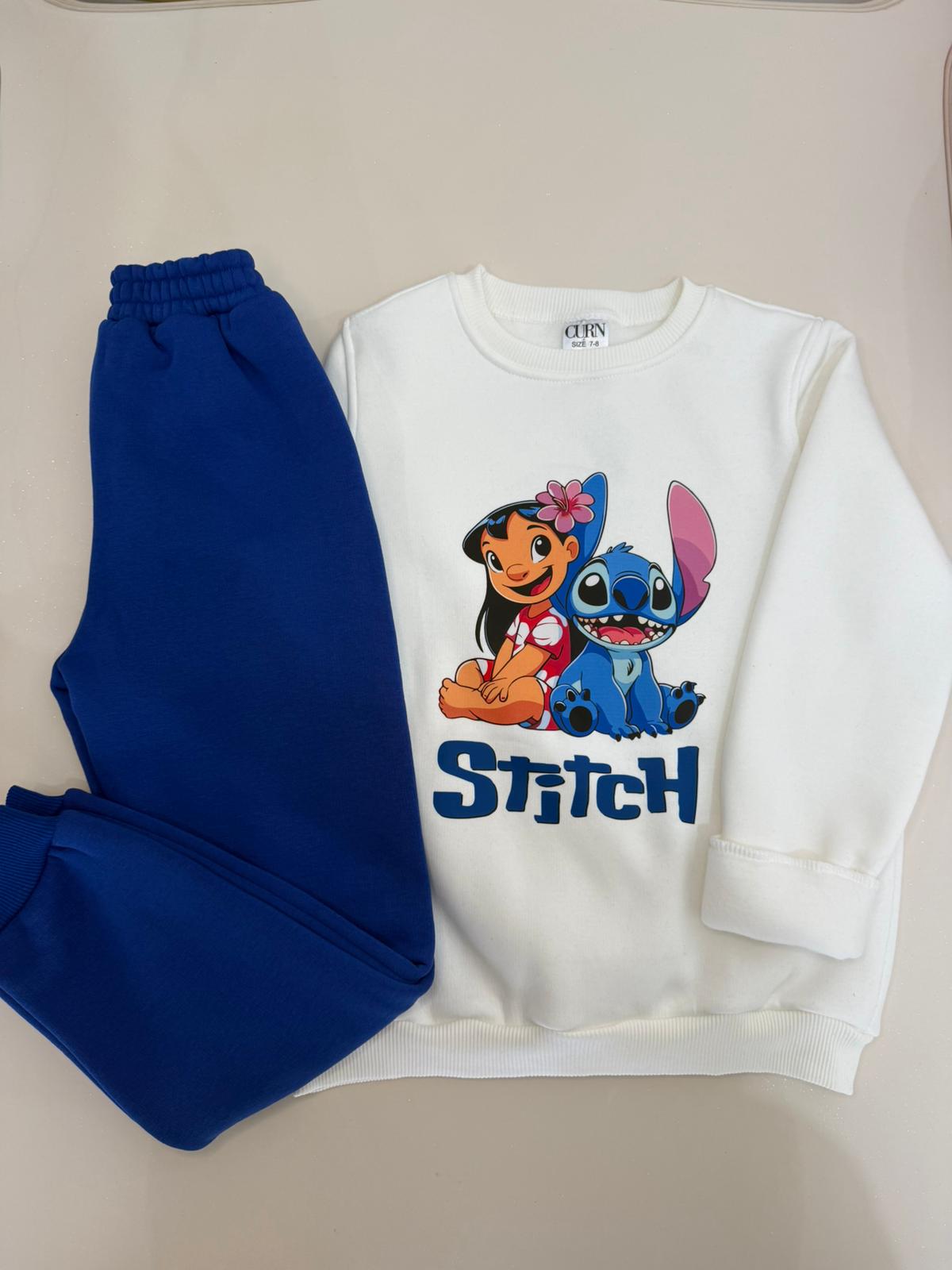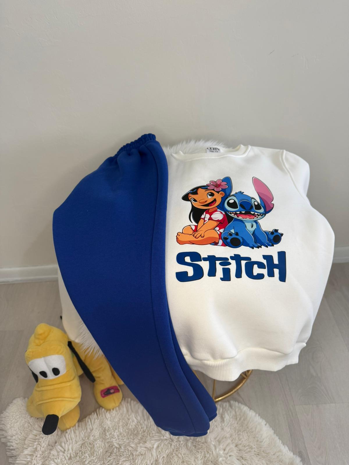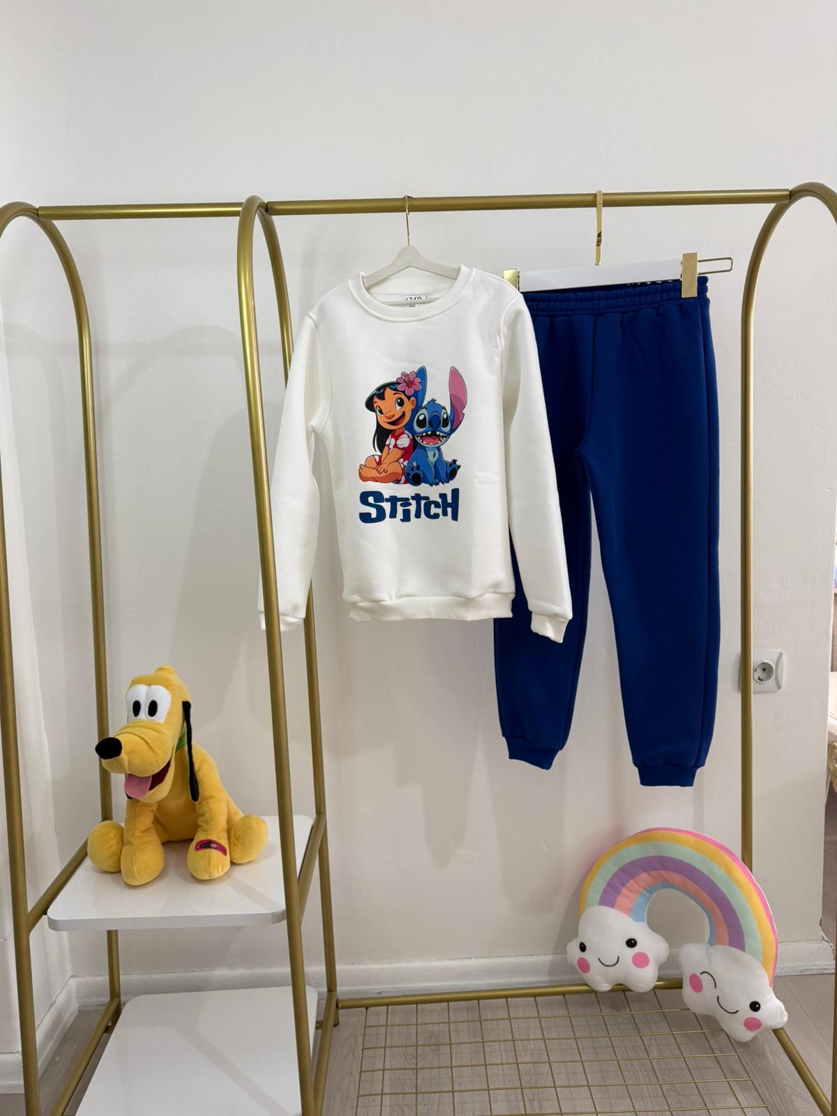 Pamuklu ve içi yumuşak tüylü, Stich Baskılı Beyaz sweat üst . Lacivert alt.